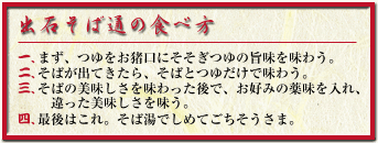 清らかな水と豊かな風土に恵まれた但馬出石。その代表的味覚、出石そば。歴史は古く宝永三年(一七〇六)に信州上田より、仙石氏がお国替えとともに、そば職人を連れてきたのが始まりとされています。その後、当地で白磁の出石焼と出合い、小皿に分けて食す今日の様式が生まれました。
